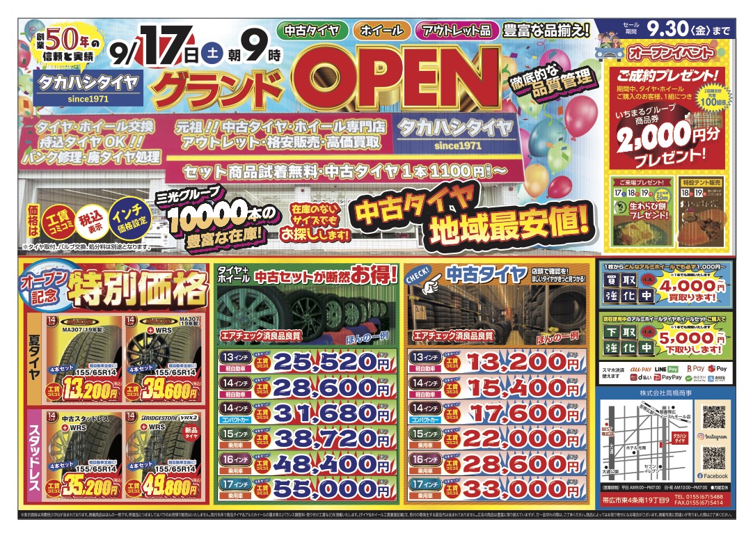 [su_animate type=”fadeInLeft”][/su_animate] 住所 〒080-0804 北海道帯広市東4条南19丁目9番地連絡先TEL.0155-67-5488 FAX.0155-67-5414 取扱商品中古タイヤ・中古ホイール 他タイヤ交換や廃タイヤ・ホイールの引取 タイヤ交換 [su_animate type=”fadeInLeft”][/su_animate] イベント タカハシタイヤ 中古タイヤ・ホイール情報 よかったらシェアしてね! URLをコピーしました! URLをコピーしました!