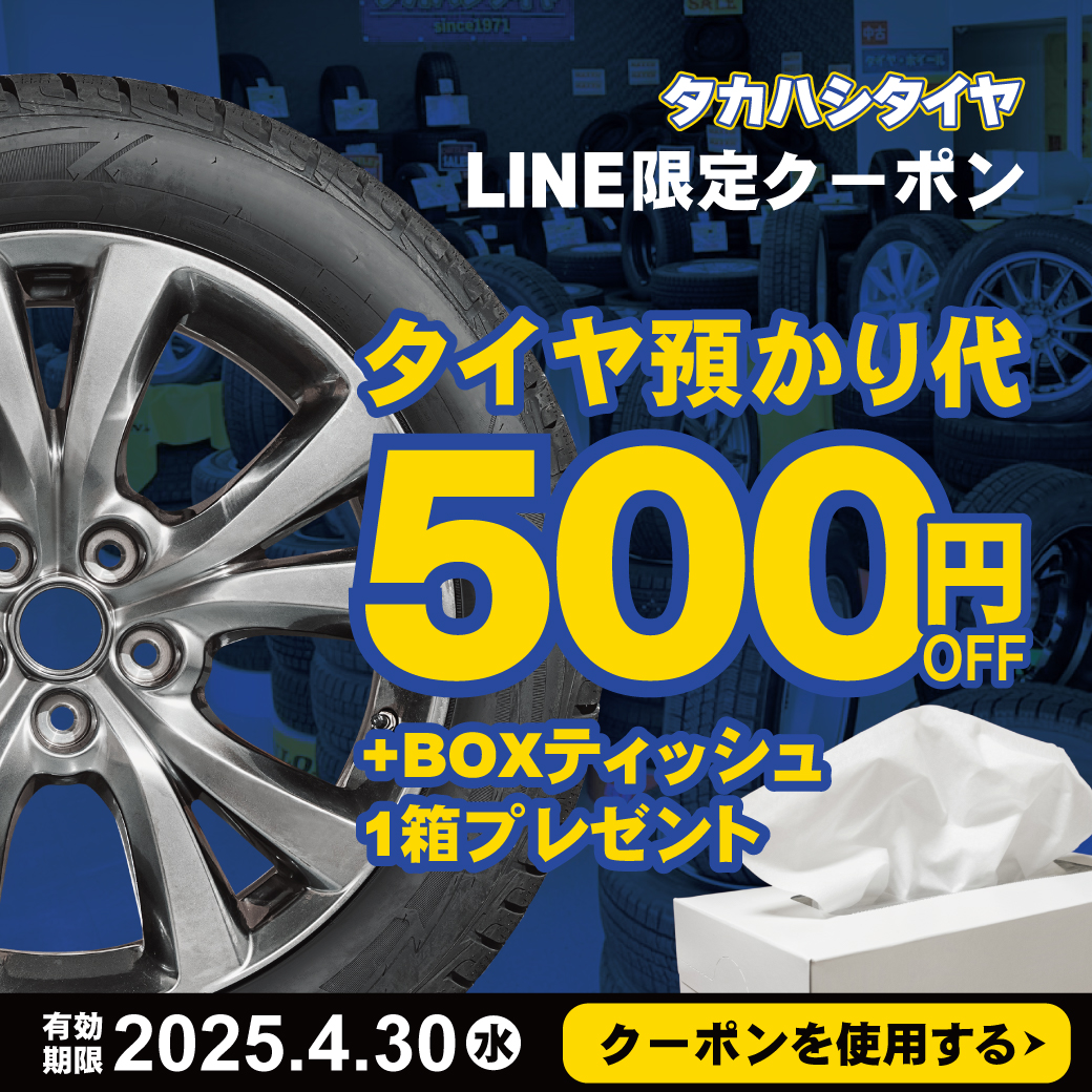 LINEお友だち限定!お得なクーポンを毎月配信しております📩今月は▶️タイヤ預かり代¥500OFF!+BOXティッシュ1箱プレゼント すでに「クーポン」をお持ちの方は今月いっぱいが期限となっております❗️まだ、「お友だち」になっていない方も、「お友だち」記念クーポンを発行しておりますので是非ご登録ください♪ ⭐️友だち追加記念クーポン⭐️その場で使える全商品対象500円OFF!是非お得な情報をGETしてください🎵 LINE タカハシタイヤ よかったらシェアしてね! URLをコピーしました! URLをコピーしました!