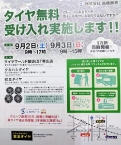 同グループ店舗のタカハシタイヤと安全タイヤでも開催しておりますので、お近くの店舗にお越しください😊
