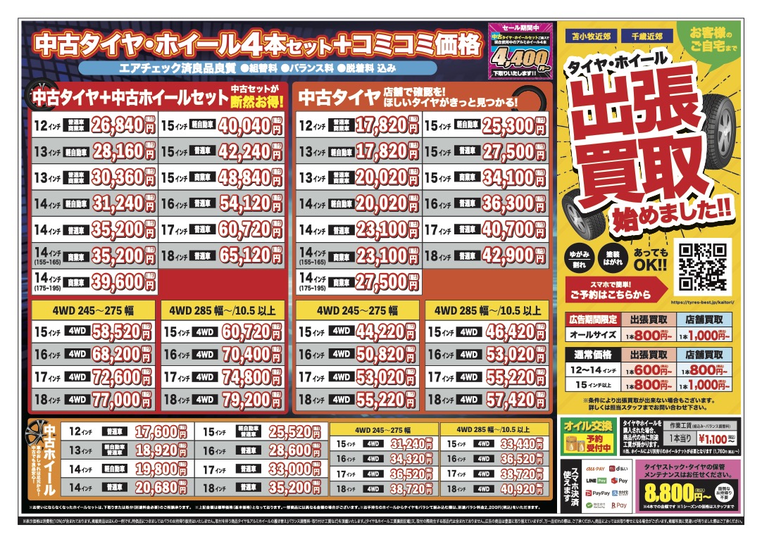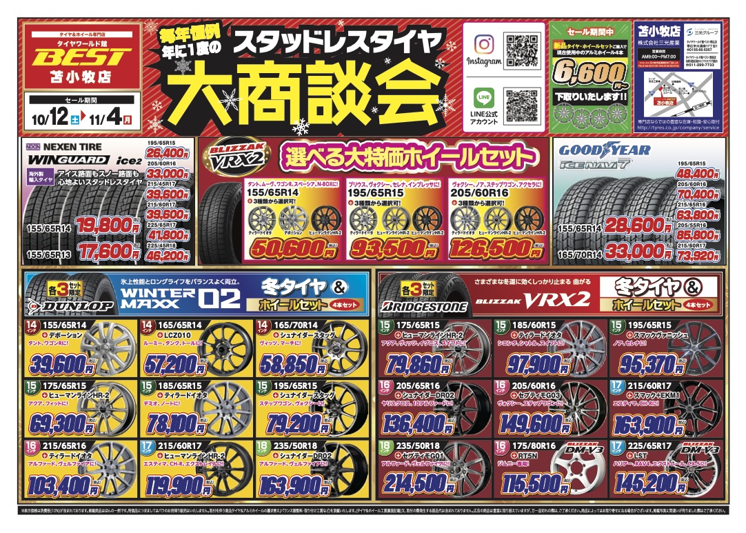【タイヤワールド館ベスト苫小牧店】スタッドレスタイヤ大商談会❗️ 〒059-1303 苫小牧市拓勇東町8丁目6-24 お知らせ イベント 中古タイヤ・ホイール情報 新品タイヤ・ホイール情報 苫小牧店 よかったらシェアしてね! URLをコピーしました! URLをコピーしました!