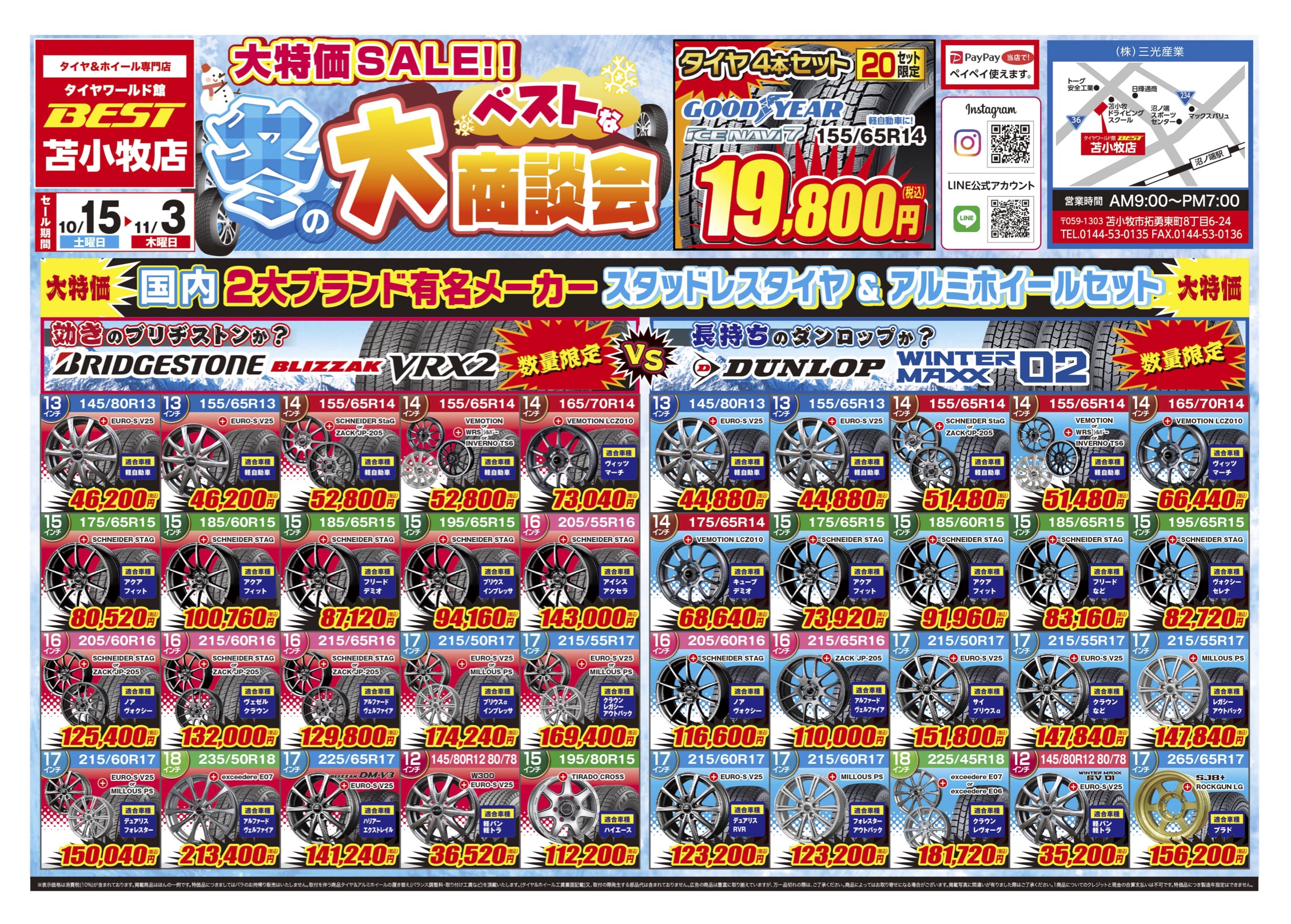 【タイヤワールド館BEST苫小牧店】大特価SALE!冬の大商談会⛄️ 〒059-1303 苫小牧市拓勇東町8丁目6-24 お知らせ 中古タイヤ・ホイール情報 新品タイヤ・ホイール情報 苫小牧店 よかったらシェアしてね! URLをコピーしました! URLをコピーしました!