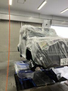 マフラー養生をしっかり行わないと熱で溶けて室内に匂いが充満してしまいます…細かい部分も丁寧に養生して行きます!