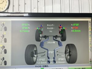 早速測定してフロントのトゥ、キャスター、キャンバーを微調整していきます。