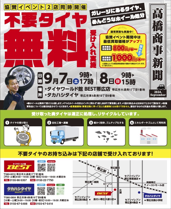 9月7日(土)・9月8日(日)タイヤ無料受け入れ実施します! 2箇所同時開催! ・タイヤワールド館BEST帯広店 ・タカハシタイヤ にて開催されます♪ -