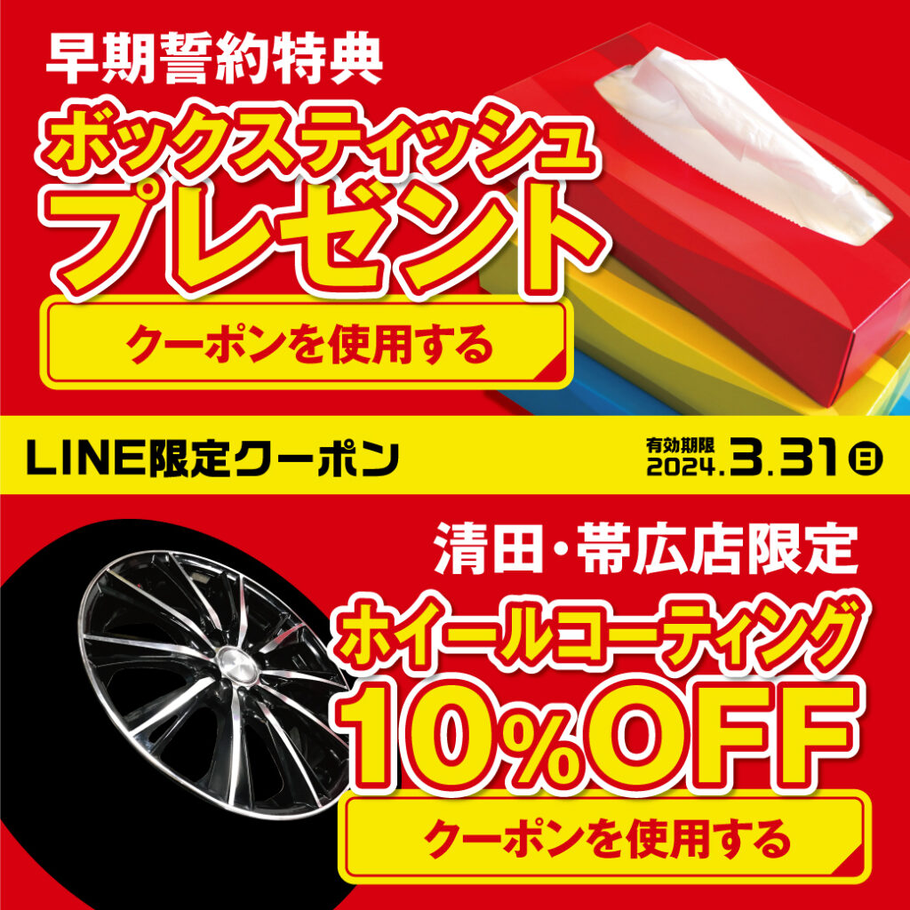 LINEお友だち限定!お得なクーポンを毎月配信しております。 今月は ☆ホイールコーティング10%OFF!(清田・帯広限定) ☆早期誓約特典★BOXティッシュプレゼント! のクーポンで2種です! すでに「クーポン」をお持ちの方は今月いっぱいが期限となっておりま... -
