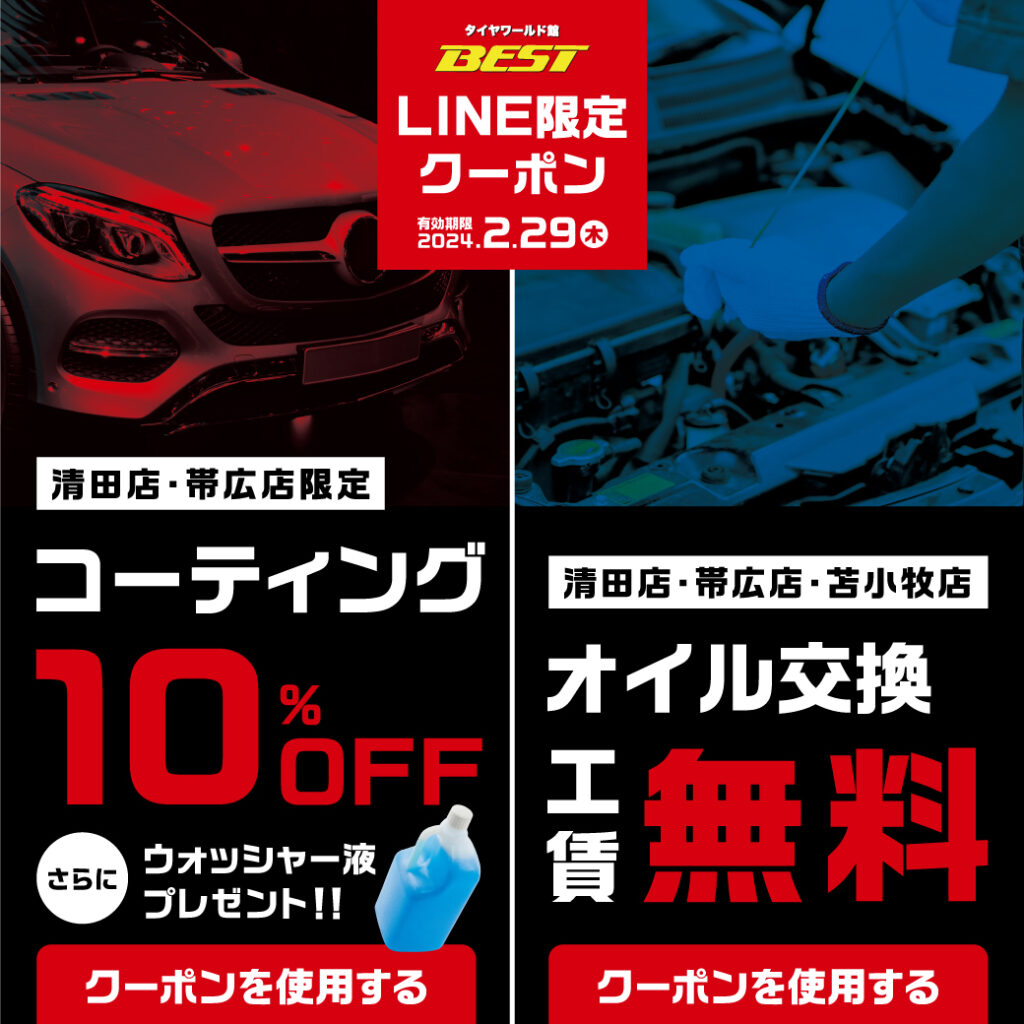 LINEお友だち限定!お得なクーポンを毎月配信しております。 今月は ☆コーティング10%OFF!(清田・帯広限定) ☆オイル交換工賃無料! のクーポンで2種です! すでに「クーポン」をお持ちの方は今月いっぱいが期限となっております。 まだ、「お友だち」に... -