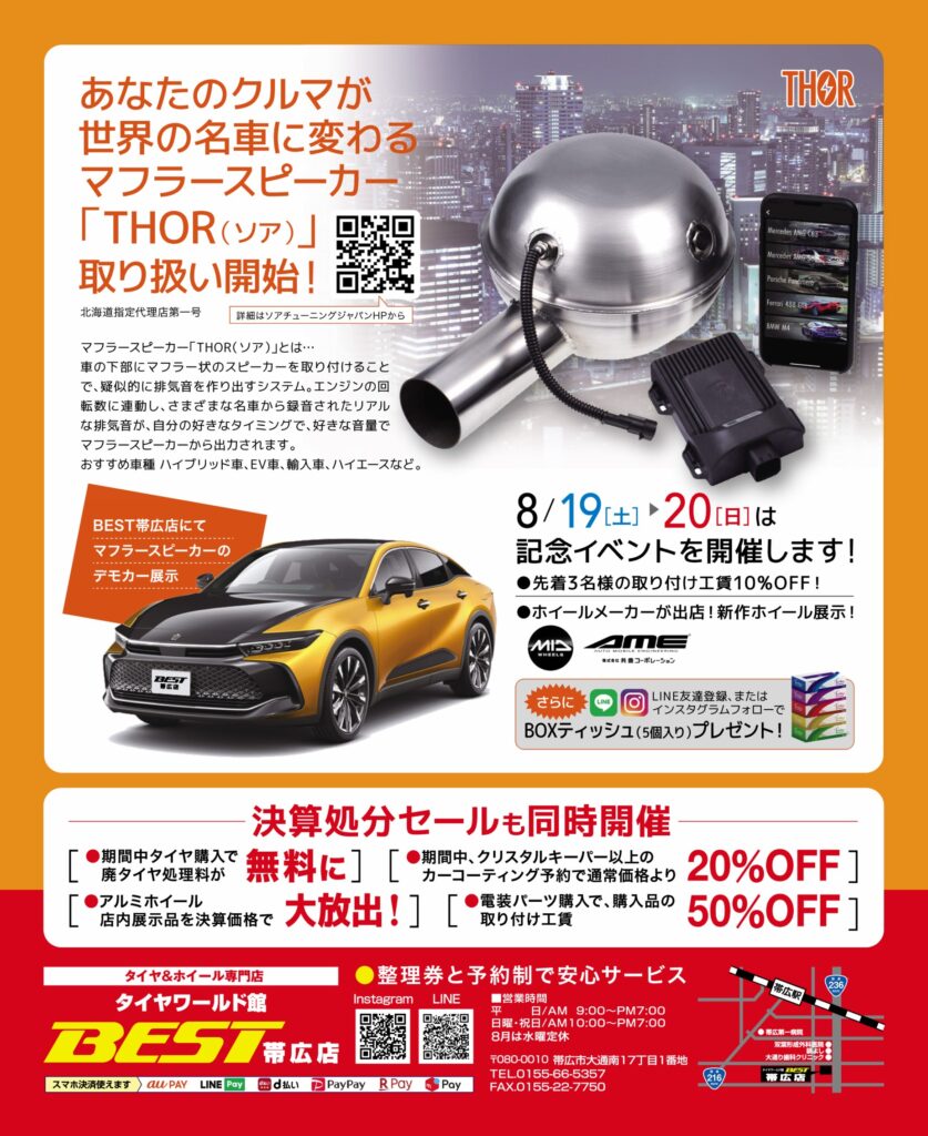 『THOR(ソア)』取り扱い開始✨記念イベント開催します❗️ 8月19日(土)〜20日(日)に記念イベントを開催! ●先着3名様の取り付け工賃が10%OFF! ●ホイールメーカーが出店!新作ホイールも展示! さらに❗️ LINEお友達登録またはInstagramフォローでBOXテ... -
