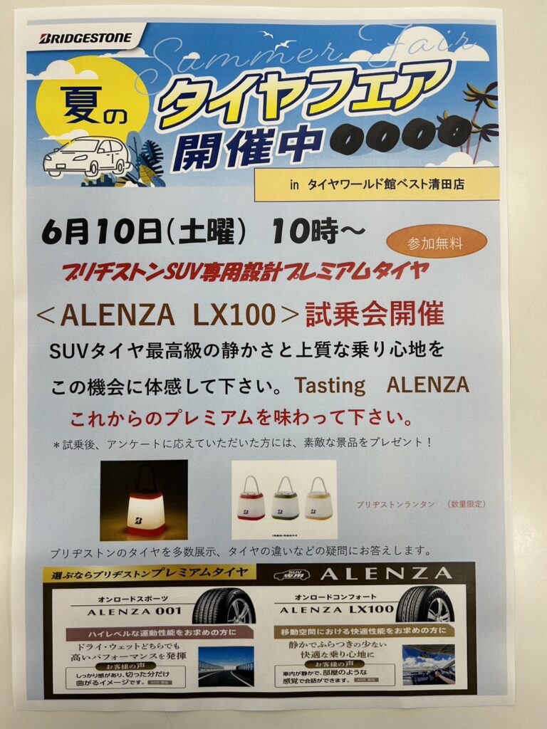 皆さんこんにちわ🤩 タイヤワールド館BEST清田店です! 速報です! 今回ブリヂストン様と協力の元 ベスト清田店で夏のタイヤフェア開催致します👍👍👍 SUVタイヤ最高級のALENZA LX100を試乗出来ます!! また他社メーカー様との比較も行いますので乗り心地... -