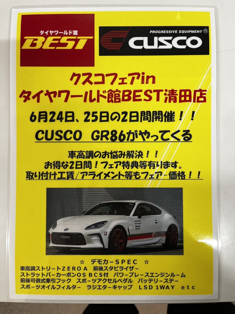 皆さんこんにちわ! タイヤワールド館ベスト清田店です。 ⭐️本日はイベントのご案内⭐️ このたび弊社では、『クスコフェア』 を表記日程で開催いたします‼️ ので、ここにご案内申し上げます。 ぜひ皆様お誘い合わせの上、お越しくださいますようお願い申... -