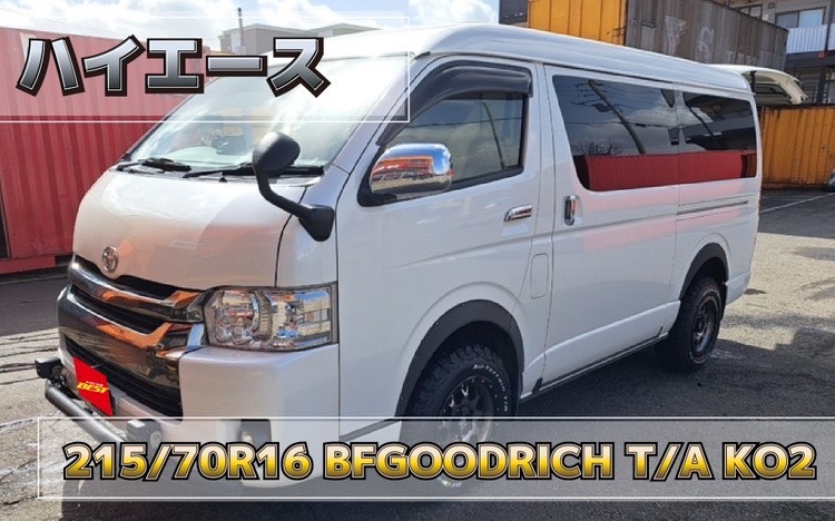 こんにちはー 苫小牧店です😆 今回は上げ仕様のハイエースに215/70R16 BF Goodrich T/A KO2装着です👏 王道のホワイトレターが白ボディーとマッチして カッコイイ😍 お店の店内にも少ないですがSUV.4x4.VANコーナー作ってますので気になる方... -
